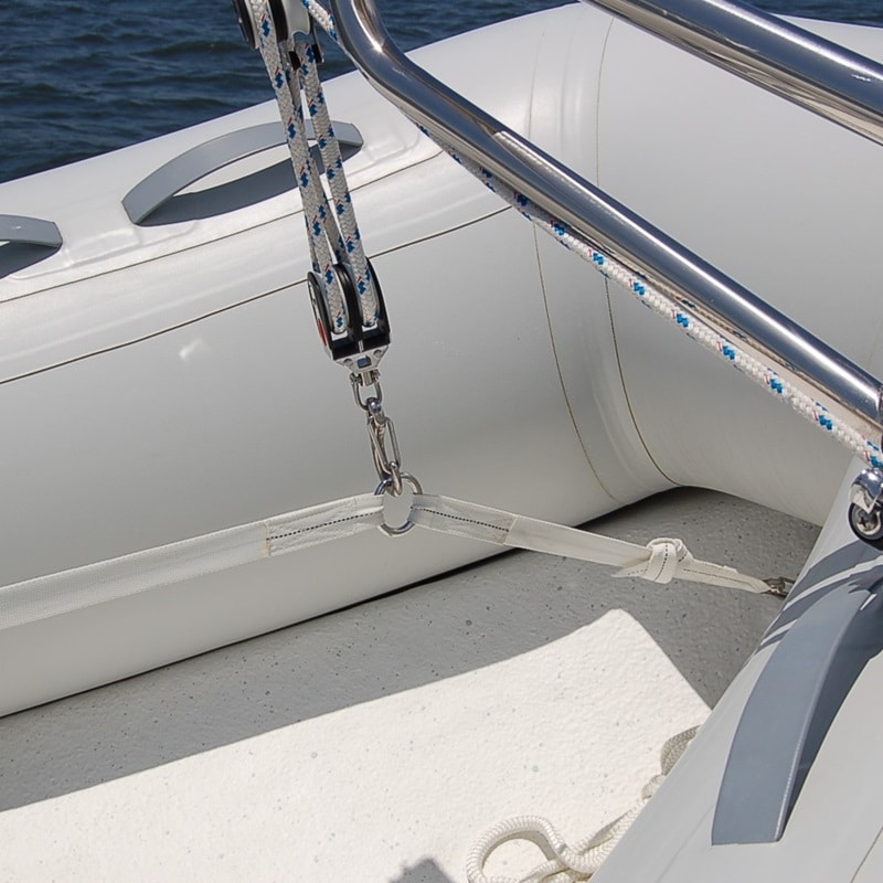 The 3-point dinghy lift harness provides a secure connection between the davit hoisting tackle and the dinghy. Includes three adjustable dinghy attachment points with harness clips and two lifting rings. Constructed of heavy-duty 1-inch polyester webbing and 316 stainless steel hardware.